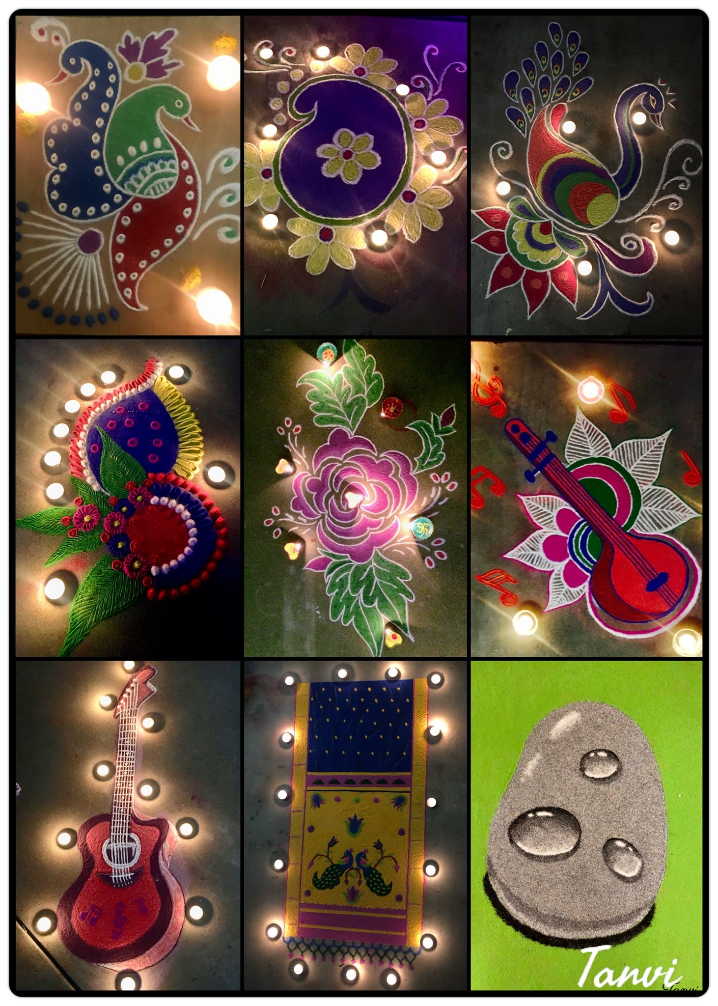 Art, for me, extends far beyond traditional paper and digital screens to include a diverse world of photography, rangoli (colored sand art), paper quilling, and rock painting. This eclectic collection represents my love for experimentation and my belief that any surface can become a masterpiece. From the temporary, festive beauty of sand art illuminated by lamps to the permanent, tactile charm of painted stones, these works celebrate creativity in all its vibrant forms.